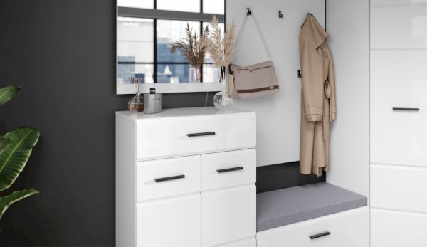 Прихожая Йорк выполнена в современном стиле – сочетает в себе функциональность и эффектный внешний вид: строгая горизонтальная фрезеровка фасадов, контрастные черного цвета ручки и задняя стенка из ХДФ. Глянцевые белые фасады High Gloss из МДФ и зеркала наполняют помещение светом, делают ее ярче и просторнее. Компактная и вместительная, с небольшой глубиной модулей, она поможет правильно организовать систему хранения даже в небольшом помещении.