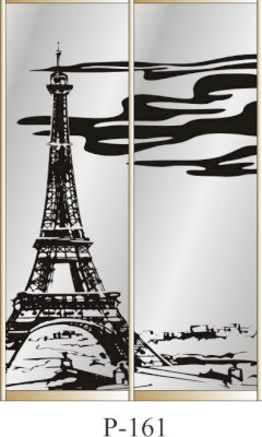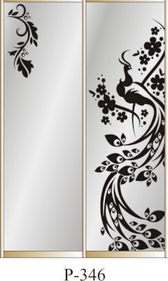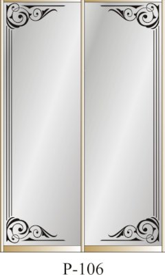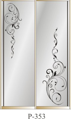 Данное изображение представлено в следующих цветах: корпус - Дуб Сонома, фасады - зеркало с пескоструйным рисунком, рамка двери и треки - Серебро матовое.