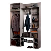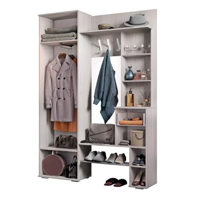 Прихожая Шанель обратит на себя внимание с первого взгляда. Выполненная в комбинации темного и светлого цвета ясеня, она имеет оригинальный орнамент на фасадах. Модель наполнена всеми необходимыми зонами для хранения вещей, включая несколько открытых полок. Большое зеркало, встроенное в дверцу распашного шкафа.