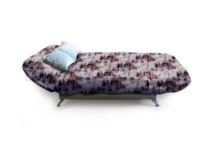 Дизайн дивана-кровати отличается оригинальностью, а также имеет съемный стеганый чехол, который по мере загрязнения можно постирать. В качестве обивочного материала для съемного чехла подойдет цветная качественная ткань: флок, терможаккард и другие.