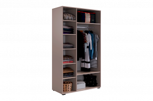 Шкаф имеет удобное наполнение: слева расположены полки для хранения вещей, а справа - штанга для вешалок. Это позволяет рационально использовать пространство и разместить различные типы одежды.