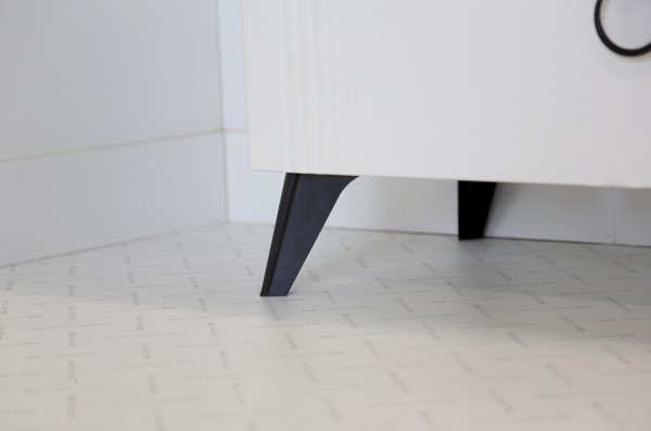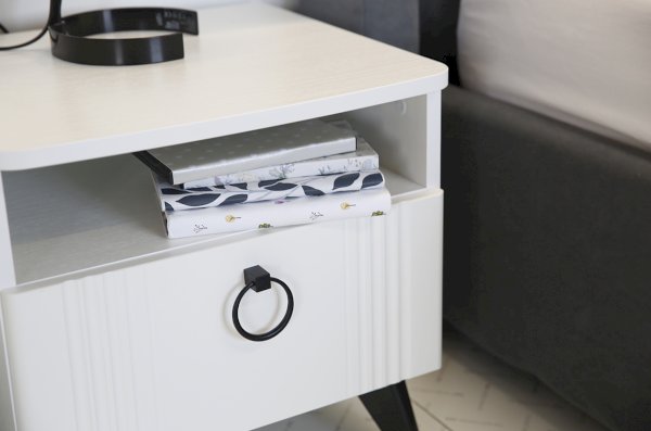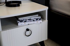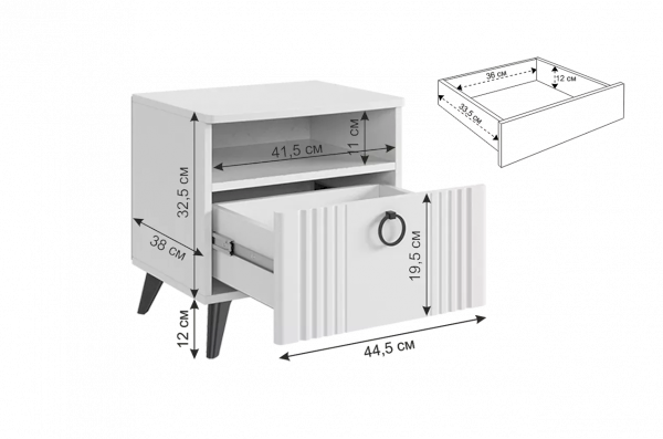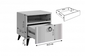 Откройте для себя прикроватную тумбу "Ева" - элегантность и функциональность в одном. Размеры 450х428х446 мм, корпус из ЛДСП белого дерева, фасады из МДФ с матовым покрытием ПВХ. Вертикальные фрезерованные полосы и трендовая металлическая ручка-кнопка добавляют изысканности. Система бесшумного закрывания, один ящик и ниша для хранения обеспечивают комфорт и удобство. Шариковые направляющие и черные пластиковые опоры высотой 120 мм подчеркивают стиль и современность. Прикроватная тумба "Ева" – идеальное сочетание качества, стиля и функциональности для вашей спальни.