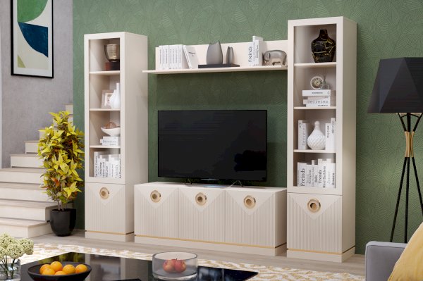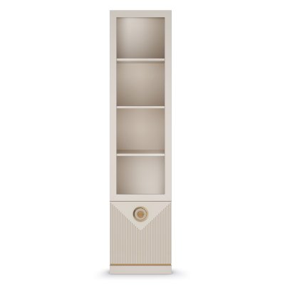 Витрина со стеклом украсит пространство гостиной. Ее образ продиктован модными тенденциями и спросом покупателей.  Цветовая гамма гостиной Капри успокаивает и создает атмосферу мира и покоя в доме. Мебель выполнена из ЛДСП и МДФ в кремовом оттенке сатин, а акценты в виде ярких ручек в цвете золото и золотой кромки по периметру дна корпуса придают мебели респектабельный вид. Особый шарм витрине обеспечивает фрезеровка фасада тонкими синхронными линиями. При покупке витрины обратите внимание, что модуль представлен в двух исполнениях : правая и левая витрины открываются на соответствующую строну.