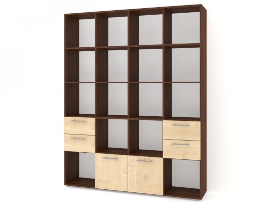 Применение задней стенки из ЛДСП (в ячейках с ящиками и фасадами) позволяет использовать данный стеллаж для зонирования пространства (чтобы предотвратить опрокидывание, необходимо обеспечить крепление стеллажа к стене).