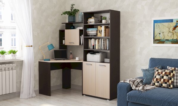 Стеллаж и пенал можно устанавливать как с левой, так и с правой стороны от углового стола, а также использовать как отдельный элемент.