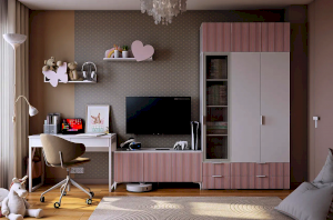 Комплектация: Навесная полка Сердечко, навесная полка Бабочка, однодверный шкаф, двухдверный шкаф, трехдверная антресоль, письменный стол, тумба