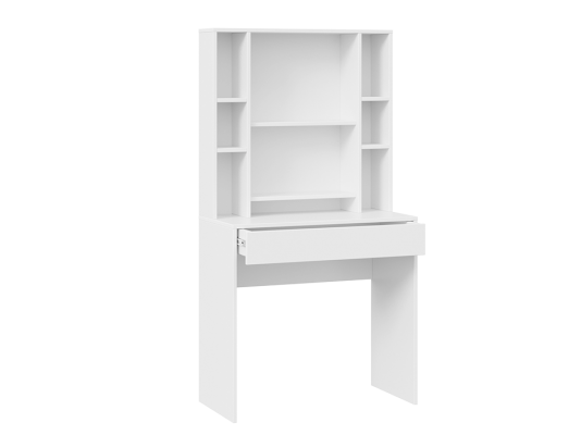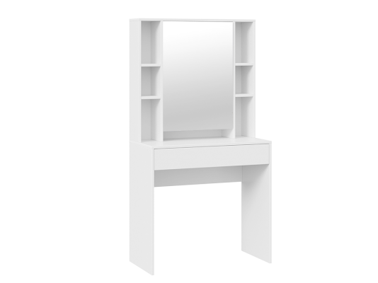 Помимо внешней привлекательности стол имеет большое зеркало, за которым размещены скрытые полки для хранения всех необходимых аксессуаров и косметики. Наличие открытых полок позволит установить предметы декора, а практичный выдвижной ящик добавит места для необходимых мелочей. В этом туалетном столике нет ничего лишнего, только самое необходимое для уголка женской красоты.