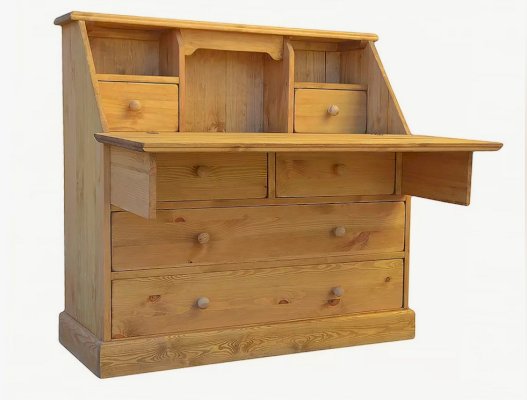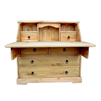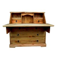 Комбинированная конструкция классического типа. Имеет откидную панель. За ней находятся открытые отсеки и два ящика. В нижней части секретера расположены два широких и два узких ящика.