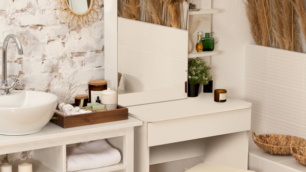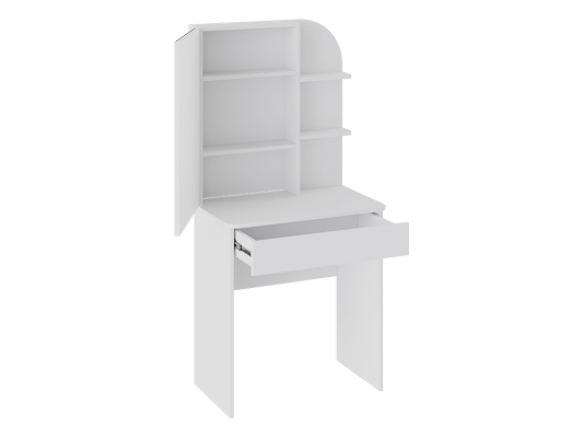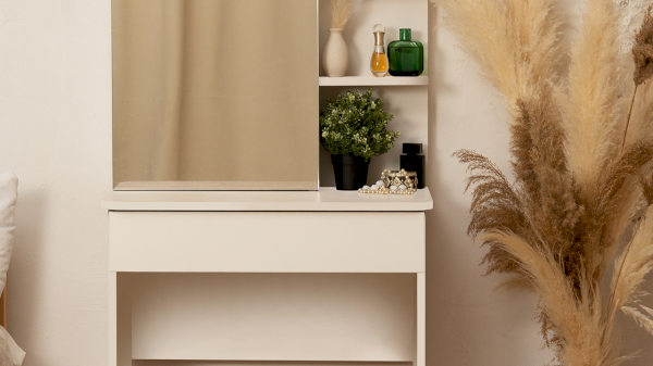 Несмотря на свои компактные размеры, туалетный стол имеет функциональный ящик с шариковыми направляющими для хранения парфюмерии, достаточно вместительную столешницу, где можно разместить все необходимые аксессуары и полноценное зеркало, которое имеет дополнительное место с полками для хранения за дверцей.