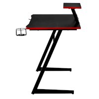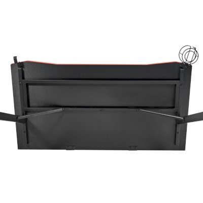 Конструкция простая и прочная: стальная рама выдержит серьезную нагрузку (заявлено до 200 кг). Стол на двух L-образных опорах впишется в любой уголок дома, его легко перемещать, удобно собирать и  разбирать. Несмотря на лаконичность дизайна, он очень стильно смотрится: строгая черная столешница «под карбон» отделана красной кромкой.