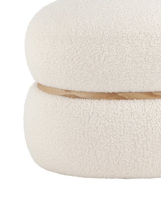 Лаконичный круглый пуф в скандинавском стиле. Мягкая обивка выполнена из искусственного меха тедди - очень мягкий и приятный на ощупь материал. Прочный каркас из фанеры выдерживает на грузку до 150 кг. Вставка по середине из светлого массива дерева гармонично сочетается с белой обивкой.