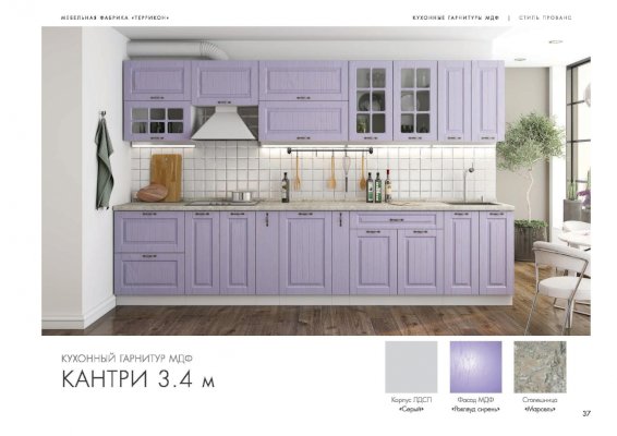 Ослепительная чистота и свежеть царят на кухне, обставленной мебелью из гарнитура «Кантри». Особую атмосферу создает отделка бирюзового, голубого, сиреневого цветов. Простой дизайн и хорошо различимая текстура натуральной древесины придает интерьеру деревенскую стилистку. Для изготовления комплекта использованы качественные и экологичные материалы.