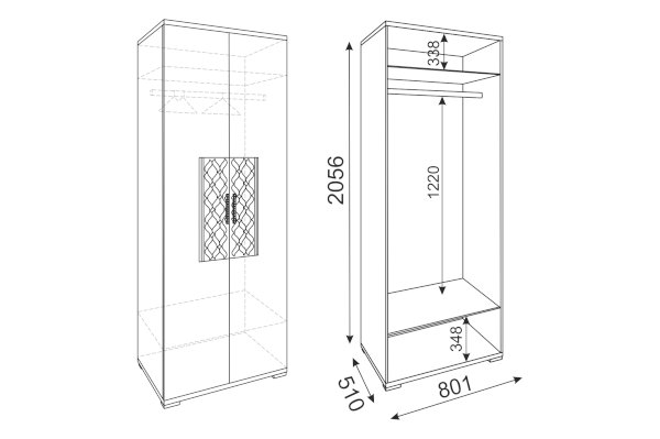 • Шкаф имеет отделение со штангой для вещей на вешалках и 2 полки: съемную нижнюю и жесткую верхнюю.