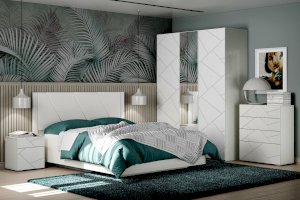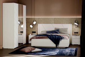 Все ручки в мебели — скрытые. Элементы изголовья кровати обтянуты мягким кожзамом, а оригинальное основание с эффектом «парения» преображает интерьер. В выдвижных ящиках используется система скрытых направляющих Quadro stop control, что позволяет легко и почти бесшумно использовать ящики. Большие зеркала шкафа визуально расширяют пространство комнаты и сделают утренние и вечерние ритуалы еще приятнее.