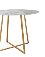Лаконичный обеденный стол для кухни. Круглая столешница с рисунком белого мрамора выполнена из МДФ - прочного, экологически безопасного материала, который устойчив к перепадам температур и повышенной влажности. Поверхность столешницы декорирована рисунком белого мрамора, который идеально сочетается с металлическими ножками. Защитные подпятники на ножках предотвращают порчу напольного покрытия.