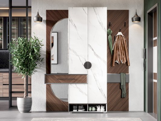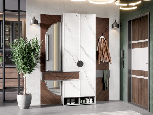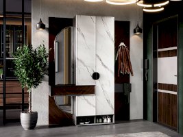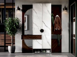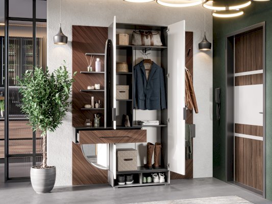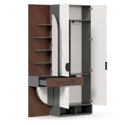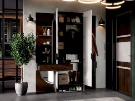 • Секция шкафа: вверху полка для шляп, под ней справа выдвижная штанга-вешалка для плечиков, слева вертикальная перегородка с двумя полками для мелких предметов, внизу ниша за одной распашной дверью