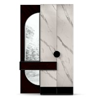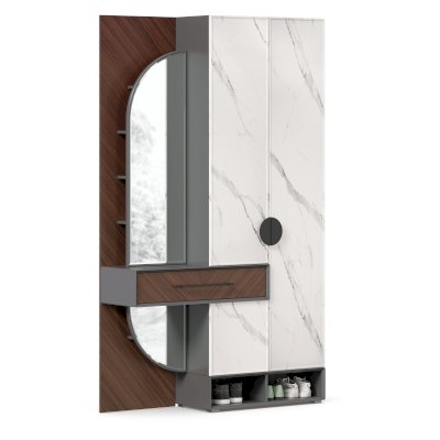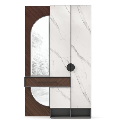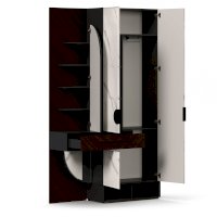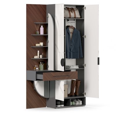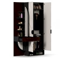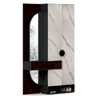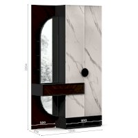 • Слева от шкафа вертикальный шит, вверху 4 полки за распашной дверью с зеркалом, внизу под ящиком полка за декоративной панелью с зеркалом