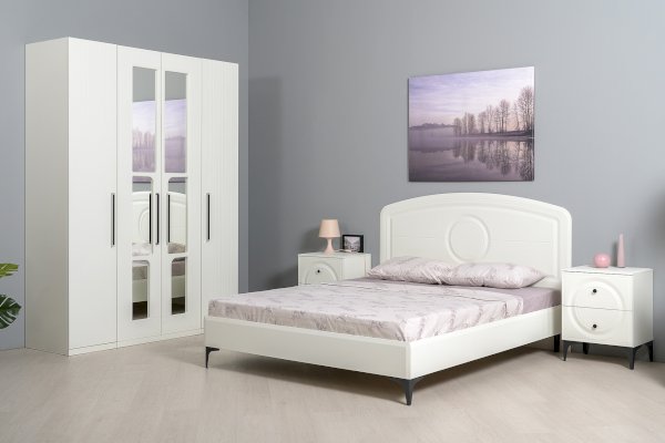 Кровать установлена на высокие ножки, что делает конструкцию лёгкой и воздушной, изголовье кровати декорировано фрезеровкой. Матрас укладывается на ортопедическое основание с гнутоклееными ламелями.