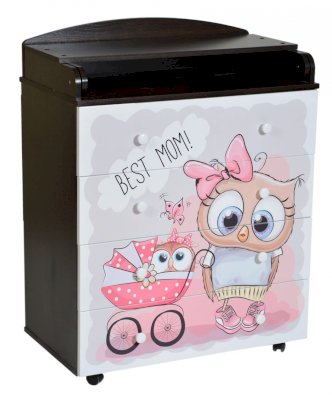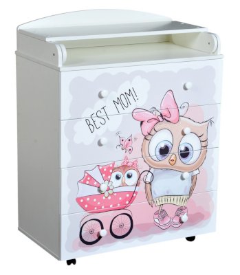 Пеленальный комод 800/4 Lilu 6 отличается привлекательным дизайном с использованием тематических детских принтов. В конструкции изделия предусмотрены 4 маленьких передвижных колеса, несколько вместительных ящичков на шариковых направляющих и откидывающаяся пеленальная столешница. Детский пеленальный комод, декорированный красочным рисунком, вмещает в себя постельные принадлежности, средства гигиены, распашонки, подгузники, игрушки, ползунки и другие личные вещи ребенка. Гладкая столешница идеально подходит для пеленания ребенка, а колесики позволяют быстро перемещать комод.