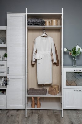 Элегантный двухстворчатый шкаф будет прекрасно смотреться в интерьере. Функциональность данной модели заслуживает внимания: внутри две вместительные полки и выдвижная штанга. Не остается незамеченной и изящная форма ручек – она придает шкафу дополнительный шарм.