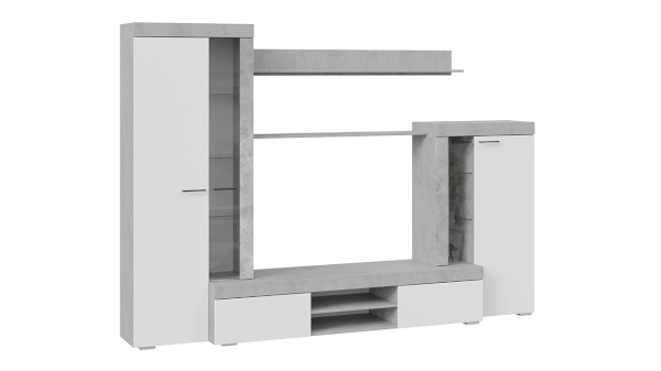 Сочетание белых фасадов, черной лицевой фурнитуры и каркасов в текстуре «Цемент светлый» способно освежить и преобразить комнату, придать интерьеру вашей гостиной современный, благородный вид.