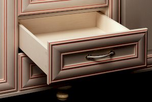 Фасады: МДФ рамочные, декор – «кремовый белый» с эффектом патины, матированное стекло, рисунки