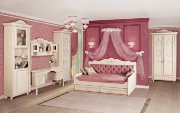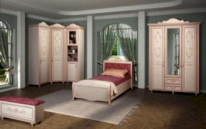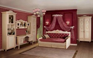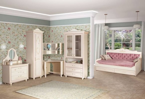 Мебель для детской комнаты «Алиса» – мебель для девочек и девушек, стилизована под Прованс, который поддержан светлым декором, цветочными рисунками и патиной на фасадах. При создании детской использовались приемы итальянского декорирования мебели. Мотивы классической росписи в сочетании с любимым мотивом детского рисунка – бабочки и цветы – создают ощущение юности и нежности. Использование декоративных элементов – корон и карнизов в наборе мебели не перегружают интерьер детской комнаты и при этом создают ощущение интерьера маленькой принцессы. Изящные ручки под золото со вставками молочно-белого цвета идеально сочетаются с кремово-белым декором и золотистой палитрой рисунков вензелей. При всей внешней легкости и утонченности мебель весьма практична в использовании, благодаря надежной фурнитуре «Hettich». Еще одним плюсом детской «Алиса» является большое количество различных модулей, позволяющих собрать комплект для любой комнаты.