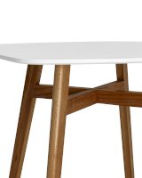Оригинальный стол в современном стиле станет прекрасным дополнением кухни или обеденной зоны. Квадратная столешница выполнена из МДФ, окрашенного в белый цвет. Ножки стола изготовлены из массива бука.