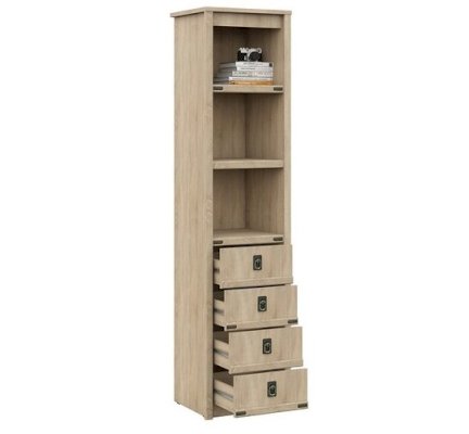 Пенал с открытыми и закрытыми полками служит для хранения учебников, тетрадей и других письменных принадлежностей. Декоративные накладки и профиль из МДФ по вертикальным краям закрывают острые края корпуса и придают шкафу более эффектный и надежной вид. Декоративные элементы на фасаде и металлические ручки MARINE бронзового цвета стилизованы под морскую тематику. Идеально компонуется со всеми модулями системы Валенсия.