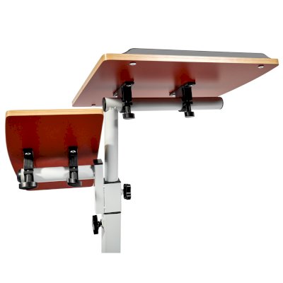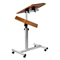 Столик оборудован поворотной столешницей из МДФ, состоящей из двух  независимых частей,  и металлическим основанием. Угол поворота столешницы составляет 180°, вплоть до вертикального положения. Высота подъема регулируется в диапазоне от 62 до 96 см. На столешнице имеются ограничители для ноутбука, планшета, предотвращающие падение гаджета.