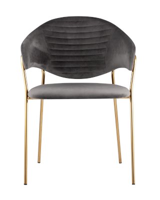 Стильный кухонный стул с оригинальной формой спинки, высокой поддержкой и подлокотниками. В качестве обивки используется мягкий вельвет. Металлический каркас золотого цвета огибает спинку и выступает аккуратным акцентом модели. Широкое сиденье обеспечивает удобную посадку и уют.