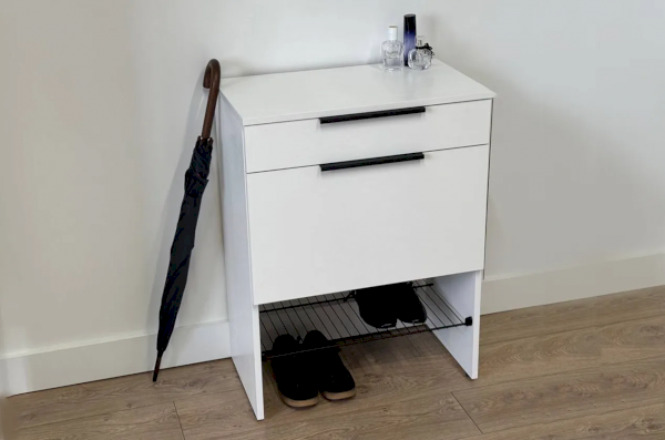 Изготовленная из прочного ЛДСП толщиной 16 мм, обувница обеспечивает надежность и долговечность. Выкатной ящик на шариковых направляющих позволяет легко и плавно открывать и закрывать его, предоставляя дополнительное место для хранения мелочей.